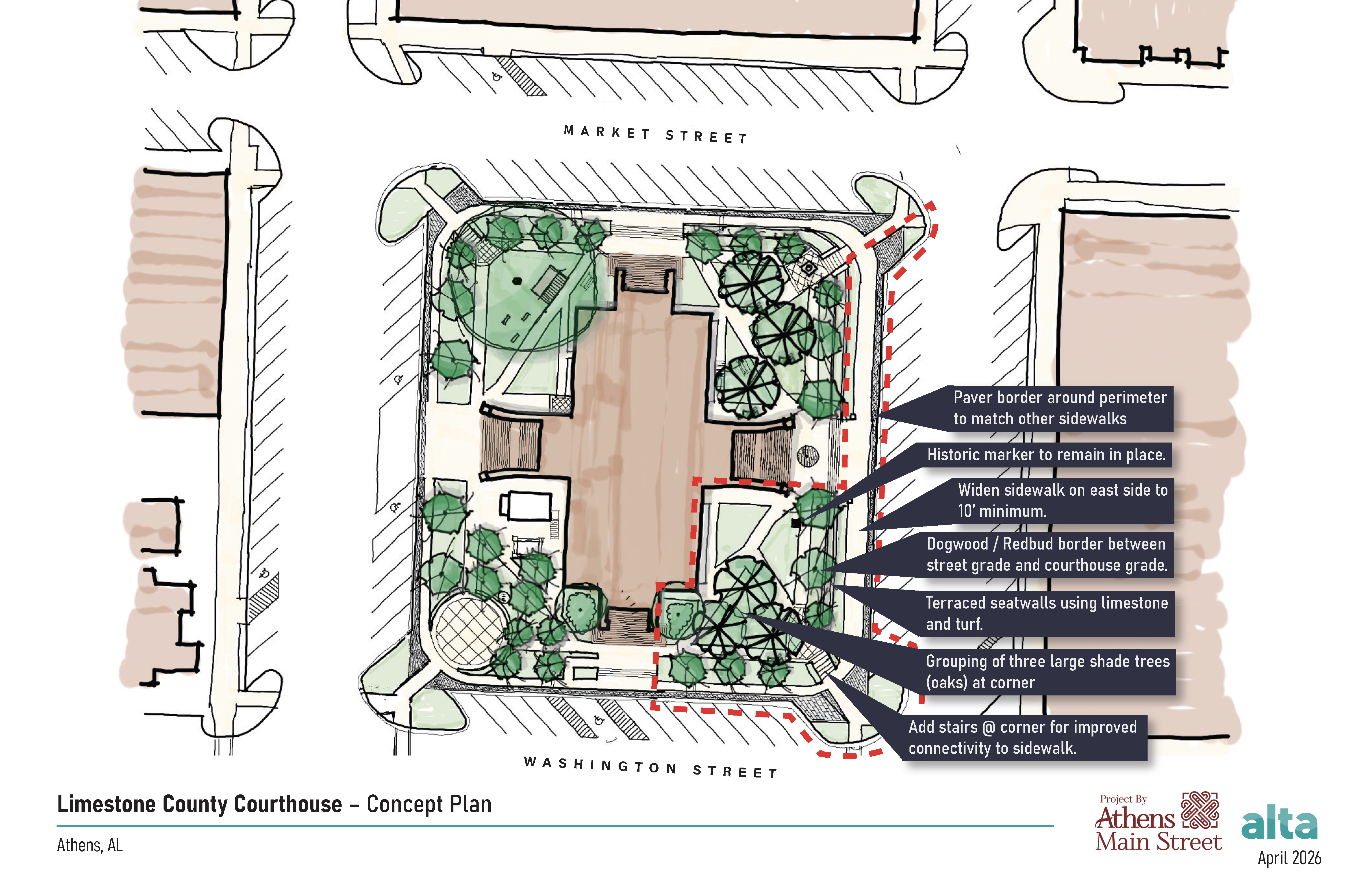 Athens Main Street and the Limestone County Commission have entered into an agreement establishing a partnership to restore and reimagine the Limestone County Courthouse grounds in downtown Athens, a project born of the devastation caused by a December 2024 tornado and designed to create a lasting community gathering place for generations to come.